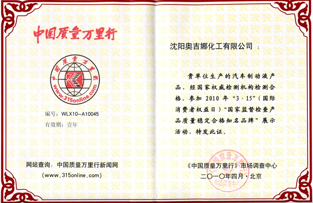 記者從沈陽奧吉娜化工有限公司獲悉,該公司制動(dòng)液產(chǎn)品參加中國質(zhì)量萬里行舉辦的“3.15國際消費(fèi)權(quán)益日”活動(dòng),獲得國家監(jiān)督檢查質(zhì)量穩(wěn)定合格知名品牌榮譽(yù)。沈陽奧吉娜由留法博士魏國平創(chuàng)建于1991年,是中國潤滑油行業(yè)歷史最悠久的民族品牌。早在1993年就被原國家經(jīng)貿(mào)委(現(xiàn)發(fā)改委)確立為中國高檔汽車制動(dòng)液中試基地,獲得“八五”國家技術(shù)創(chuàng)新優(yōu)秀項(xiàng)目獎(jiǎng),通過美國西南研究院臺(tái)架實(shí)驗(yàn)。公司以自主創(chuàng)新為企業(yè)核心發(fā)展動(dòng)力,與國內(nèi)外多個(gè)科研院所、數(shù)位院士共同進(jìn)行新產(chǎn)品和新技術(shù)的研制。2005年和2007年獲國家發(fā)改委兩大國債項(xiàng)目的批準(zhǔn)。
